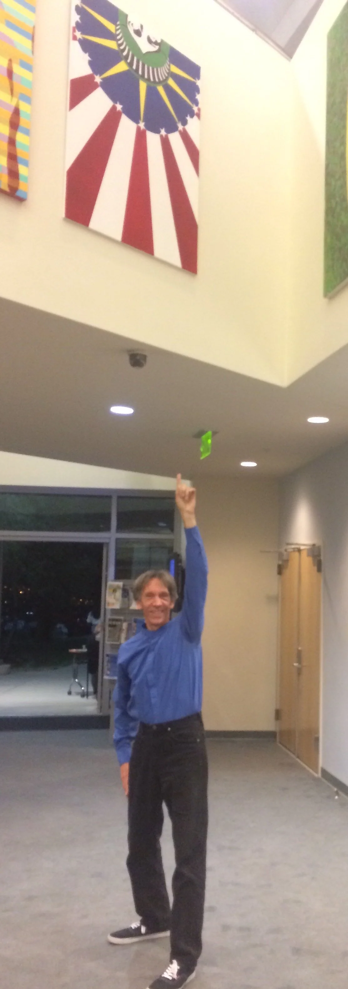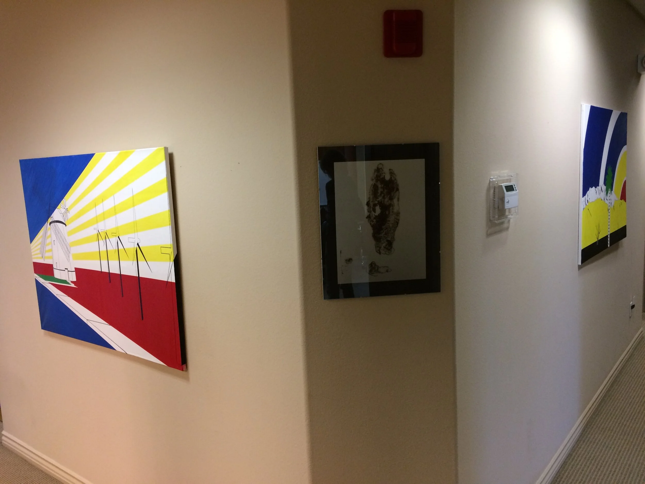 I came to the library to find a book. When I glanced to my right my eye seized upon a distant starry place. Upon entering my curiosity was thoroughly peaked [sic]. What a dazzling display! I sat down. My least favorite, if possible to have, was the starry night [Across the Universe]. Examining each piece, my brain was tickled with delight. I saw things I would do different, and I saw others that never occurred to me to do. Then I came to the starry night. “Acrylic on canvass”?! Surely not so, this must be painted brush hairs... I looked at the edge peering hopelessly to see the many fibers. It was paint! With glitter added to some other texture-y shadowy effect. “Wow,” I said to myself, “This is awesome”! Then I thought about how modern art was bumbling along for the longest time and where it might have gone. Thank you.