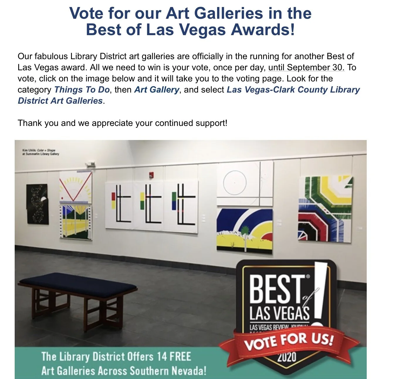The image, below, was designed for use by the 11 galleries operated by the Library system in its promotional campaign to secure the Best of Las Vegas Silver Award (2nd place), using Kim’s exhibit as its standard-bearer.